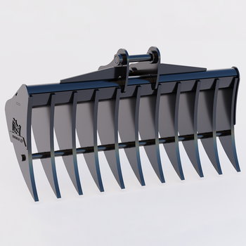 | AKA: excavator rake, land rake attachment, brush rake The excavator root rake is used to clear the ground of plants and debris before planting or building. Root rakes are commonly used by landscapers and construction sites for general land clearance and ground preparation tasks. The long tines of the landscaping rake quickly and easily removes shrubs, brambles and tree roots without removing too much soil. The Rhinox excavator brush rake is manufactured with durability in mind, featuring heavy-duty tines and a tine support bar to ensure optimal strength and prevent buckling while digging through thick materials. Our range of heavy-duty, excavator root rakes are available for mini excavators from 0.75 ton to 25 tons (2,000 lbs to 60,000 lbs) in widths of 36" wide up to 84" wide - relative to your machine size. Struggling to find the correct land rake for your excavator? Try out our Search by Machine Make and Model tool below, or give us a call and we'll be happy to help! | |