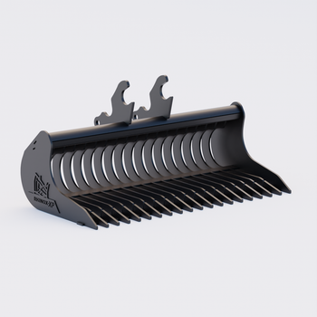 | AKA: general purpose rake, excavator rake bucket. The excavator rake bucket combines a root rake and skeleton bucket, creating the perfect tool for landscaping. It gives you the option to rake the ground and shake out materials such as rocks and roots. Rhinox rake buckets are made from solid steel with 2" to 3" gaps between the tines, allowing you to remove objects as small as half a brick. We stand by the durability of our welds by offering a lifetime guarantee on the welds and ensure seamless operation with our machine fitment guarantee . The Rhinox rake bucket range is available for mini excavators from 0.75 tons to 25 tons (2,000 lbs to 60,000 lbs), from 36" to 84" wide relevant to your excavator. | |