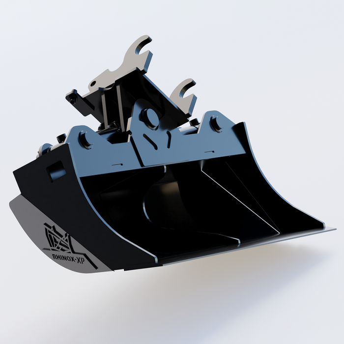 Using the same hydraulic circuit as a thumb, the Rhinox tilt grading bucket can tilt up to 45 degrees left and right (total of 90 degrees).
