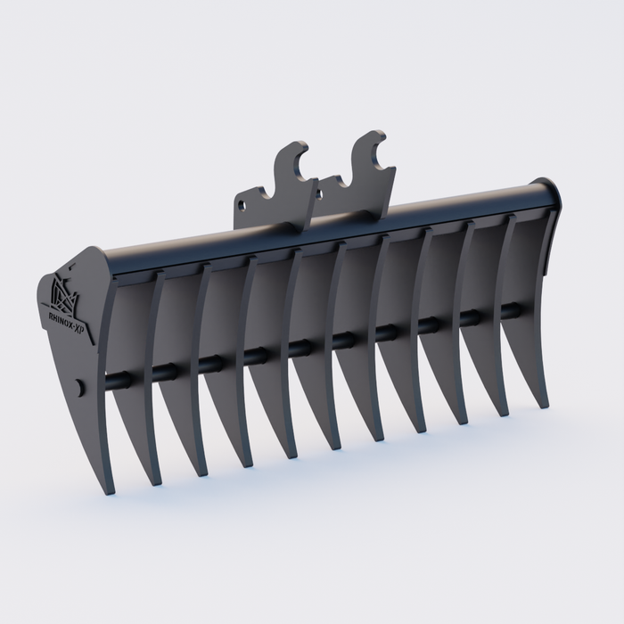 Disclaimer - The Rhinox Land Rake is not specifically designed for use with a hydraulic thumb as a "pincher." While many operators have successfully used it in this way, results may vary, and proper contact between the thumb and rake tines is not guaranteed.