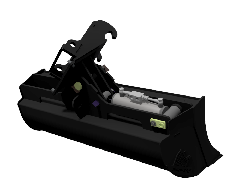 Using the same hydraulic circuit as a thumb, the Rhinox tilt grading bucket can tilt up to 45 degrees left and right (total of 90 degrees).