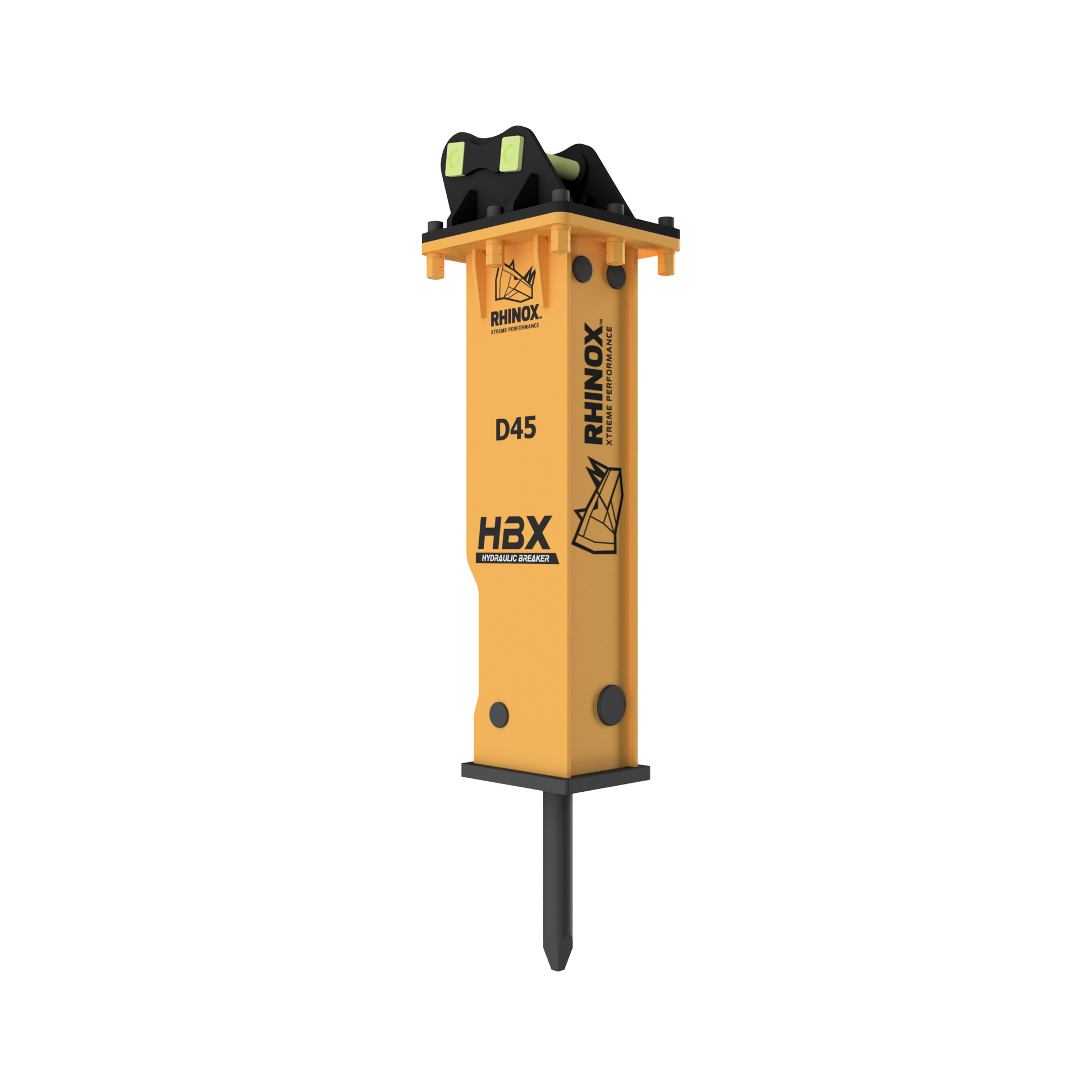 Excavator hydraulic breakers are powerful demolition attachments, designed to break apart hard rock and concrete during harsh demolition and quarrying jobs. The Rhinox hydraulic hammer connects directly into the auxiliary lines on your excavator, allowing the hydraulic pump to supply hydraulic fluid to your hammer, creating high-pressure blows.