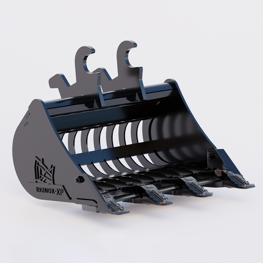 This Rhinox 24" / 600mm Skeleton Bucket (also known as a Shaker or Riddle Bucket) is specifically designed for the Hitachi ZX19U mini excavators. These buckets feature vertical riddling tines and tine braces for increased strength.